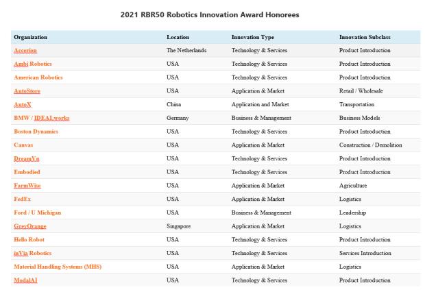 RBR Announces 2021 Robotics Innovation Award Honorees