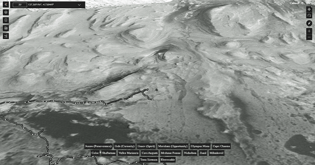The highest-resolution global image of Mars ever created is now available for viewing in B&W by armchair astronomers. View the planet’s surface and track the paths of Mars rovers. No special 3D glasses are needed. Scan the planet’s surface from various angles and easily adjust altitude on the fly. All data in the mosaic was imaged by the Context Camera (CTX) onboard the Mars Reconnaissance Orbiter (MRO). CTX was built by Malin Space Science Systems, and the MRO by JPL.