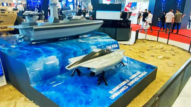 The Turkish Armed Forces (TAF) Foundation has organized the International Defence Industry Fair (IDEF) every two years, since 1993. As reported by Breakingdefense.com, the latest IDEF was Tuesday, July 25 – Friday, July 28, in Istanbul, where a multitude of unmanned systems were exhibited. Demand for underwater technology is growing and of note were new developments in remotely operated vehicles (ROVs). Havelsan unveiled a mockup of its one-way unmanned submersible called the Caka. The suicide unmanned submarine is 8.5 meters long, with a speed of 60-plus knots and a beam of 3.3 meters. Company officials said that Caka testing will start by September this year and is expected to be operational within two years. Also, Turkish defense industry firm STM announced plans to develop an autonomous unmanned submarine, with an option of future swarming capability. STM general manager Ozgur Guleryuz said, “STM have been dealing with submarines for quite a long time, we are building submarines we are modernizing submarines…” He indicated that the development phase is expected to be finalized by the second half of 2024, leading to a prototype “which will work for proof of concept for full autonomy.” Next to Havelsan’s stand was Turkish missile producer Roketsan, debuting its first naval missile defense system, the Levent. It can carry up to 11 missiles and is mounted with four radars. The company officials at its stand told Breaking Defense that the display system is an actual system and not a mockup, and that the system will be operational in the next two years. Photos by Agnes Helou / Breaking Defense.