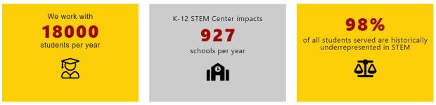 “The USC Viterbi School of Engineering K-12 STEM Center is committed to providing equitable, culturally responsive opportunities for youth, families, and schools. Diversity, equity, and inclusion are core values that guide us in our work to actively address systemic inequities in STEM Education and provide programs that build personally relevant knowledge and skills, self-efficacy, and leadership within a community of learning and practice. For 40 years, USC Viterbi School of Engineering has collaborated with K-12 schools, teachers, and students to strengthen STEM pathways that broaden college and career options. Our programs and research-based interventions offer project-based experiences that support the Common Core and Next Generation Science Standards and serve the nation’s urgent need for a STEM-ready workforce.” Goals:
