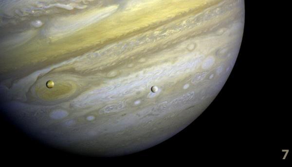 7. Voyager 1 image of Jupiter and its Great Red Spot, with Io (at left) and Europa transiting in front of the planet. JPL NASA via Weathernationtv.comtv.com.