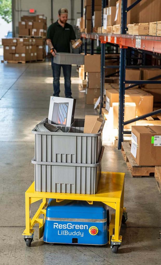The LilBuddy AMR brings automated movement to any business through its optimized, compact size and flexible natural feature guidance, ResGreen said. Featuring a 17-inch by 17-inch base, LilBuddy is one of the smallest AMRs in the market, with an ability to rotate 360 degrees to help with congested environments and narrow aisles.