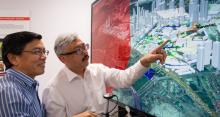 NTU Professor Low Kin Huat (left) and Air Traffic Management Research Institute’s Deputy Director Mr Mohamed Faisal Bin Mohamed Salleh discussing an NTU-developed air traffic simulation, which takes into account various solutions to enable safe and efficient drone travel in Singapore. Credit: NTU Singapore